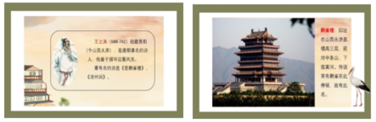 “PPT的设计要从背景开始,考虑与课文内容相匹配;页面要干净整洁,不要太花哨,喧宾夺主;风格要统一,不能一个背景拉到底。这两周讲古诗,《静夜思》思乡、月夜、孤独,适合选用清冷、淡蓝的底色与内容一致;《登鹳雀楼》有奔腾的黄河及夕阳壮美的景色,原先的背景不合适。好的背景能帮助学生融入诗情画意的境界,能更准确地理解课文。当学生闭着眼睛背诵这首诗的时候,画面就变成了诗。”