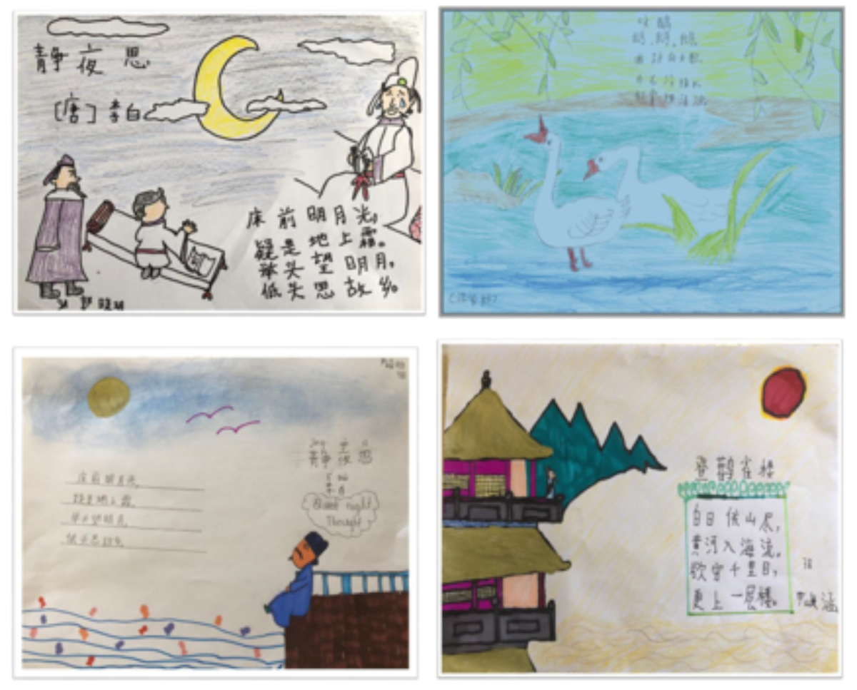 “诗是无形画,画是有形诗”,课后的练习,余老师布置了为古诗配画的作业,以加深对古诗的理解。一天的时间,作品纷沓而至。除了刚学过的两首,还有同学为“每周一读“中的《咏鹅》也配了画,积极性很高。孩子们的作品描绘出了自己的意境和理解,老师也收获到了教学的喜悦。