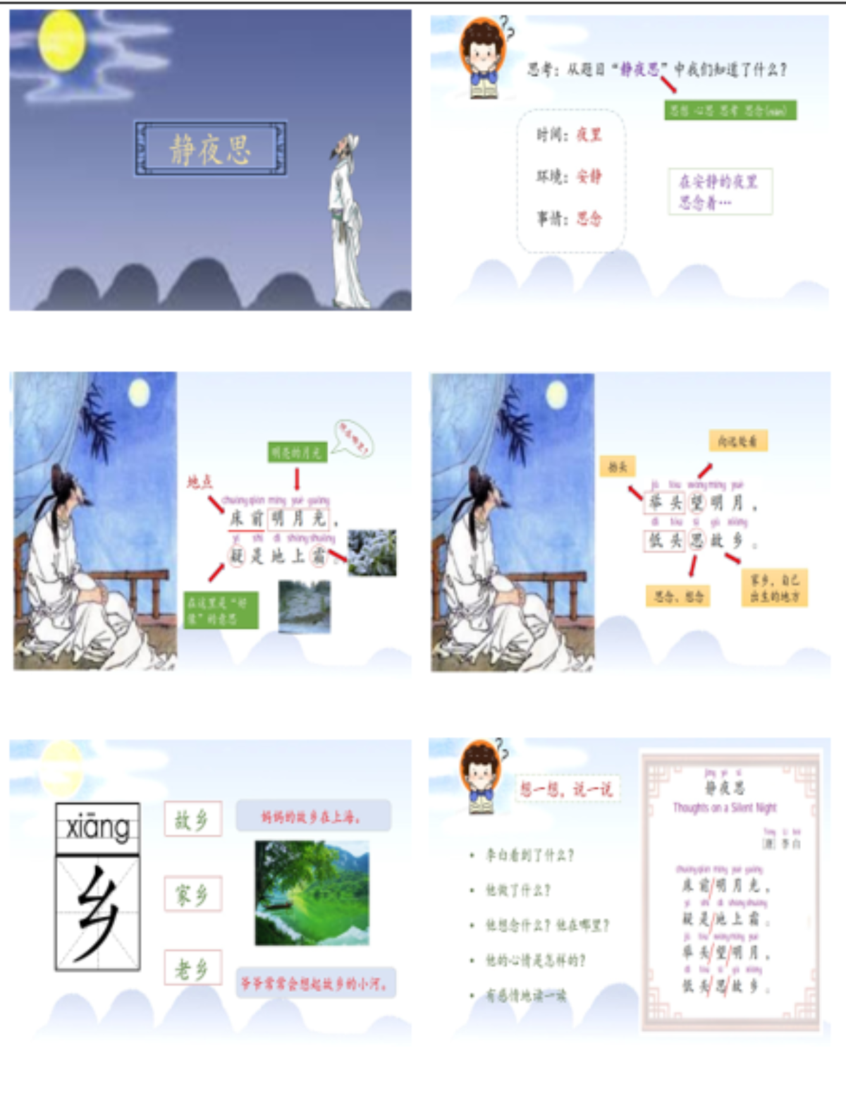 “诗是谁写的呢?他和李白一样,都是唐朝的。穿大褂留胡子的,是古代人。”“他住哪儿呢?晋阳,现在的山西太原。”
